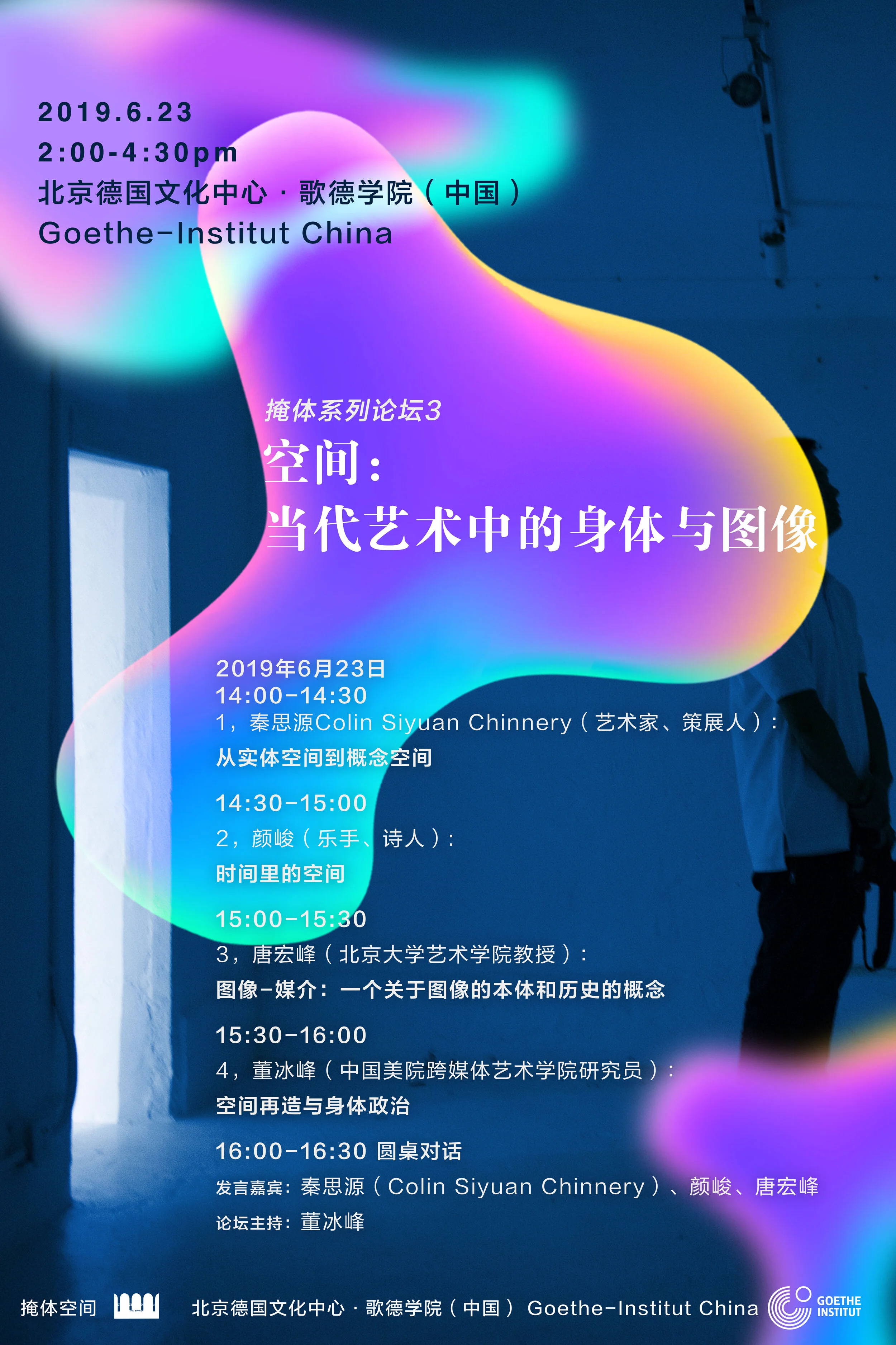 论坛《空间:当代艺术中的身体与图像》由掩体空间与歌德学院合作,秦思源、颜峻、唐宏峰与董冰峰等四位策展人、艺术家和研究者,分别就策展、艺术表演、图像研究与身体艺术等主题进行演讲。论坛由掩体空间联合执行人董冰峰主持。